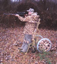 This is one of the neatest adaptaions that has come across my desk in a long time.The rifle rest is a deadshot treepod which is very well made. Rich over at handy help had a bracket made for his outdoor wheele chair to hold the rest in place. We are going to do something simular to use here next year.