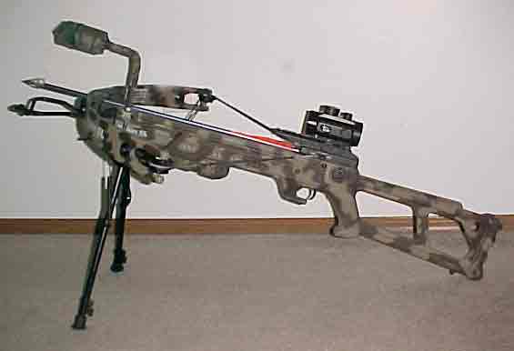 I obviously had to make a lot of changes for archery hunting as well. I use the same sip-n-puff trigger setup on the crossbow. The first 2 pictures are of the Horton I used to use. You can see the tab at the back of the stock I use to aim as well. The final picture is me at my setup with my TenPoint crossbow. I harvested my first doe hands free in the fall of 07 with the crossbow. 08 gave me a nice buck with the crossbow and a doe with the rifle.