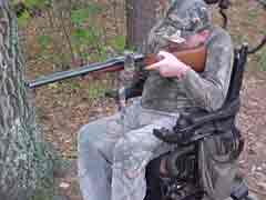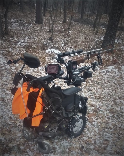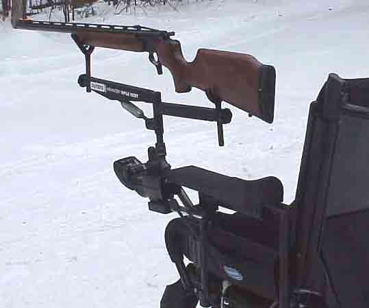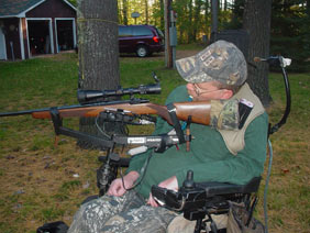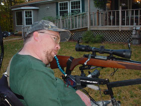 I've been shooting for a few years aiming with a tab at the back of the stock, but a kind neighbor made things a whole lot better for the 2010 hunting reason. My old rig worked ok but I was very limited as to how much area I could cover. He combined a couple rests and added lots of parts and built me a joystick controlled rest. Now I've got lots of motion using my mounth on the joystick. When I get about where I need to be, I do the fine aiming with my chin and use a sip and puff trigger. The rig worked well for aiming at several deer. I harvested one with it in late season.