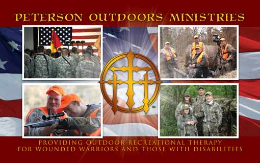 ***Peterson Outdoors Ministries is in the process of raising funds to purchase a 1019 Acre piece of property with a Lodge on it, on the Missouri/Kansas border. The Lodge will be called Lodge of Hope and will be a fully disabled accessible Lodge where Military families and those with disabilities or terminal illness can come and be ministered to and relax at no cost. Opportunities will be available for turkey, deer, waterfowl, bass fishing, boating, shooting, and more. Peterson Outdoors Ministries is a 501 c (3) non-profit organization and all donations financial or in kind are tax deductible. Donations can be made through Pay Pal on our website www.petersonoutdoors.org or sending them directly to Peterson Outdoors Ministries 9949 County Ln 212 Webb City, Mo. 64870.